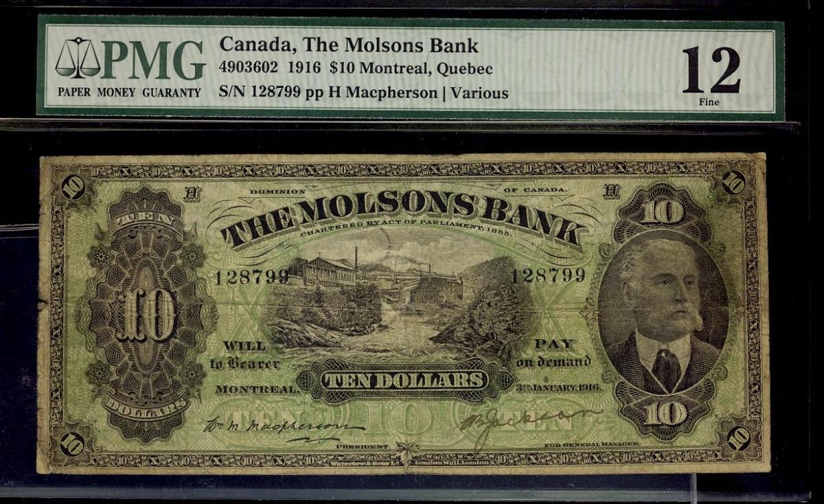 The Molsons Bank 1916 $10 #128799 CH-490-36-02 PMG F12.