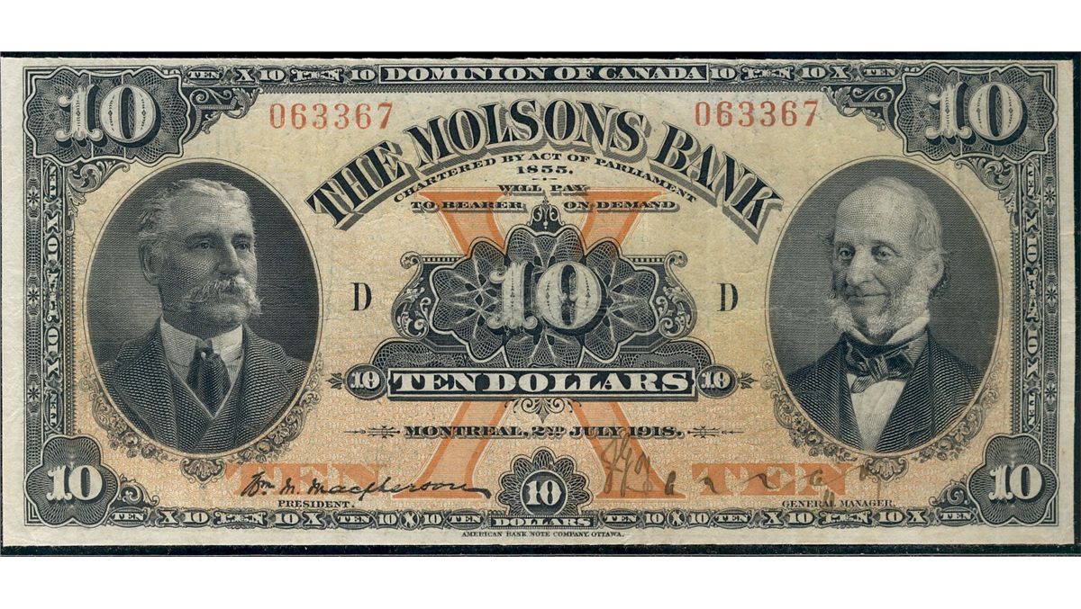 The Molsons Bank 1918 $10 #063367 CH-490-38-04a VF+ for grade.