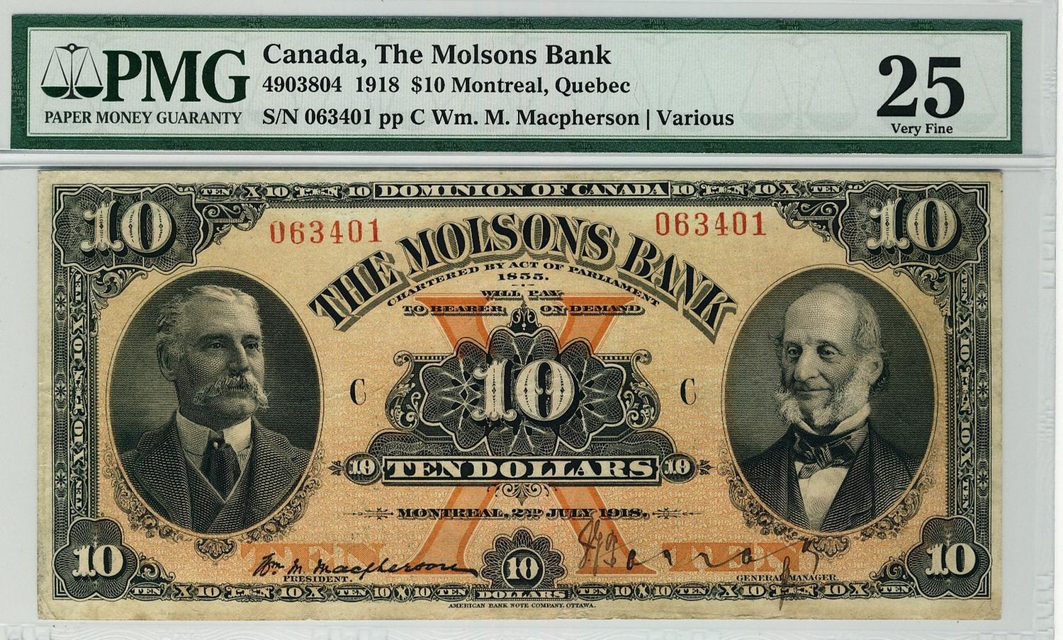 The Molsons Bank 1918 $10 063401 CH-490-38-04 PMG VF25