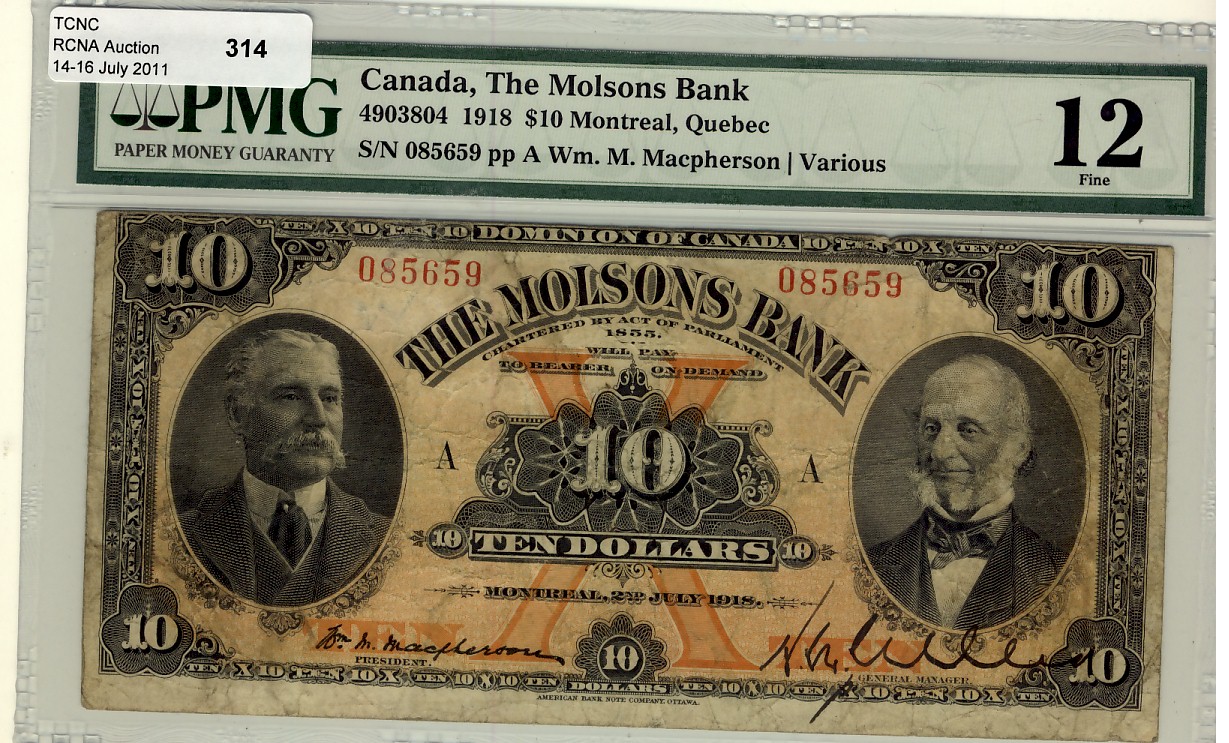 The Molsons Bank 1918 $10 085659 CH-490-38-04 PMG F12