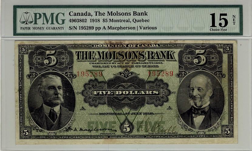The Molsons Bank, 1918 $5 #195289, CH-490-38-02, PMG F15. Only one example finer.