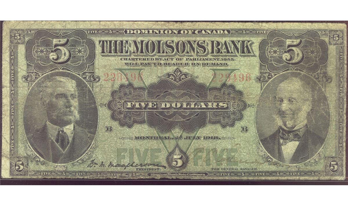 The Molsons Bank 1918 $5 #220496, CH-490-38-02, about Fine.
