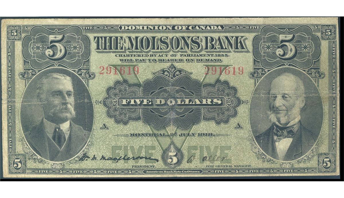 The Molsons Bank; 1918 $5 #291619 CH-490-38-02 PMG VF20 Net. Repaired.