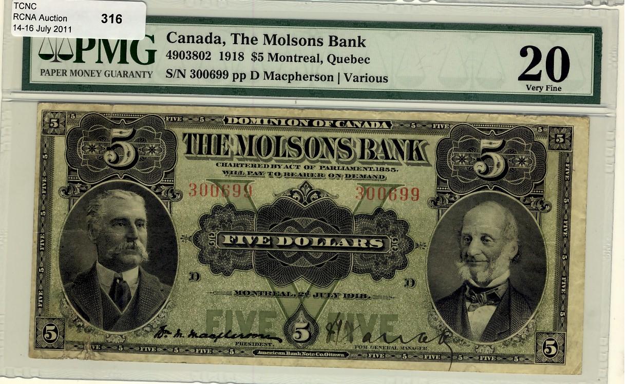 The Molsons Bank 1918 $5 300699 CH-490-38-02 PMG VF20