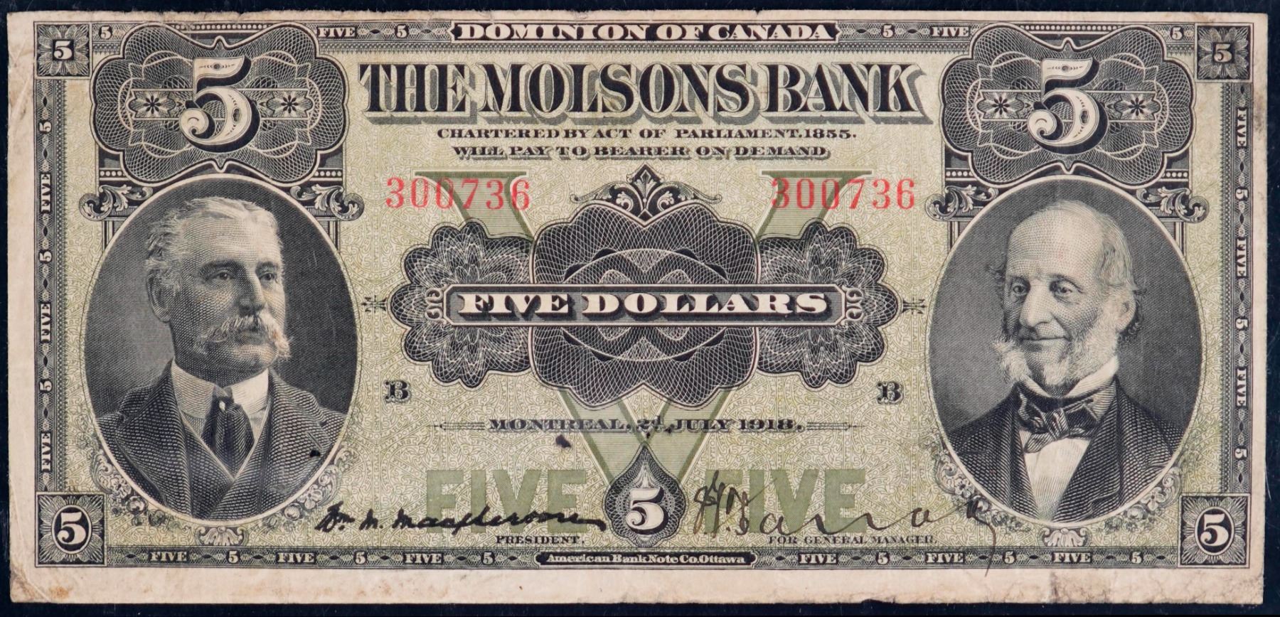 The Molsons Bank 1918 $5 #300736 CH 490-38-02 Legacy Choice Very Fine-25, minor issues.