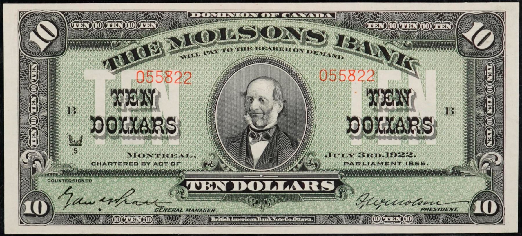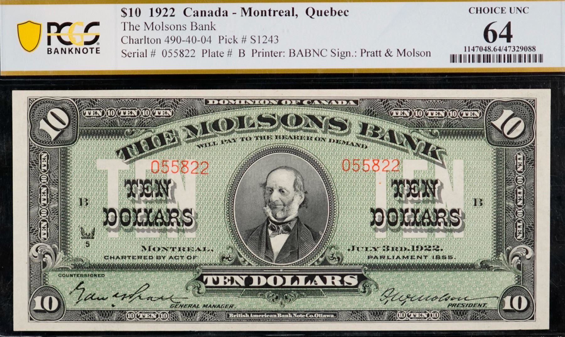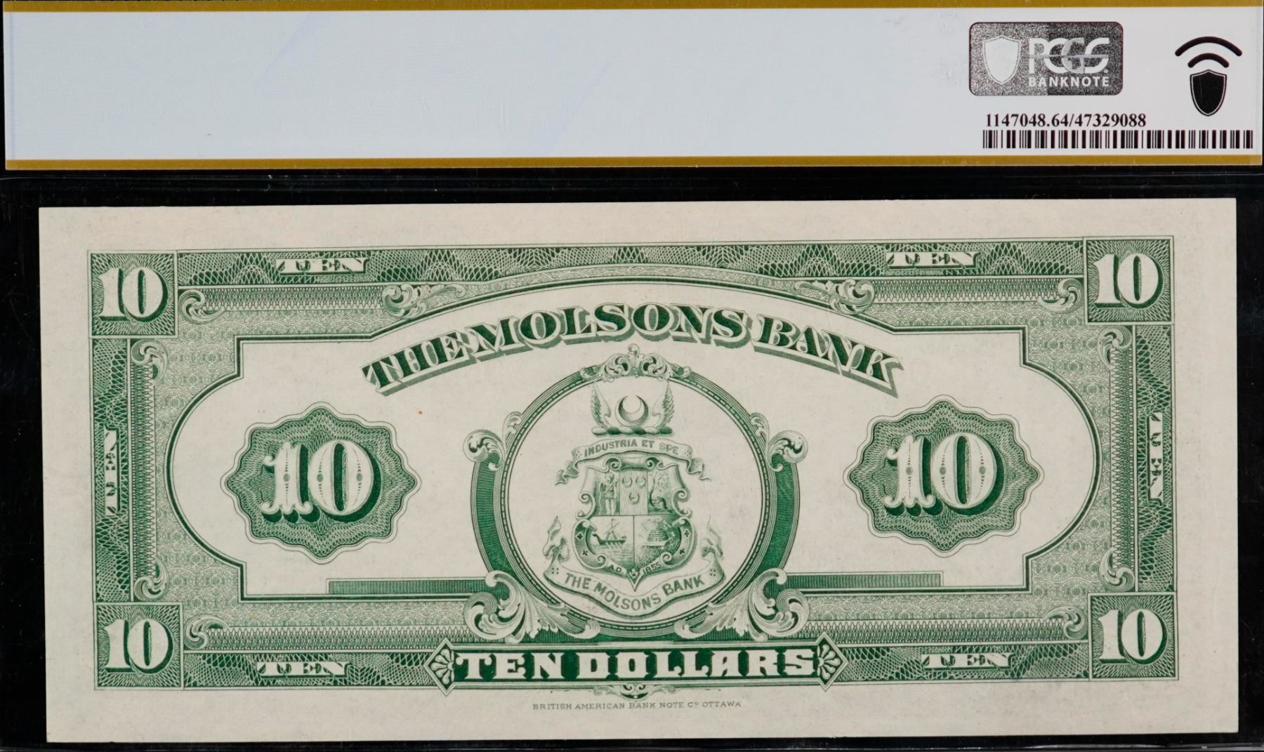 The Molsons Bank 1922 $10 #055822 CH-490-40-04 PCGS Choice Uncirculated-64