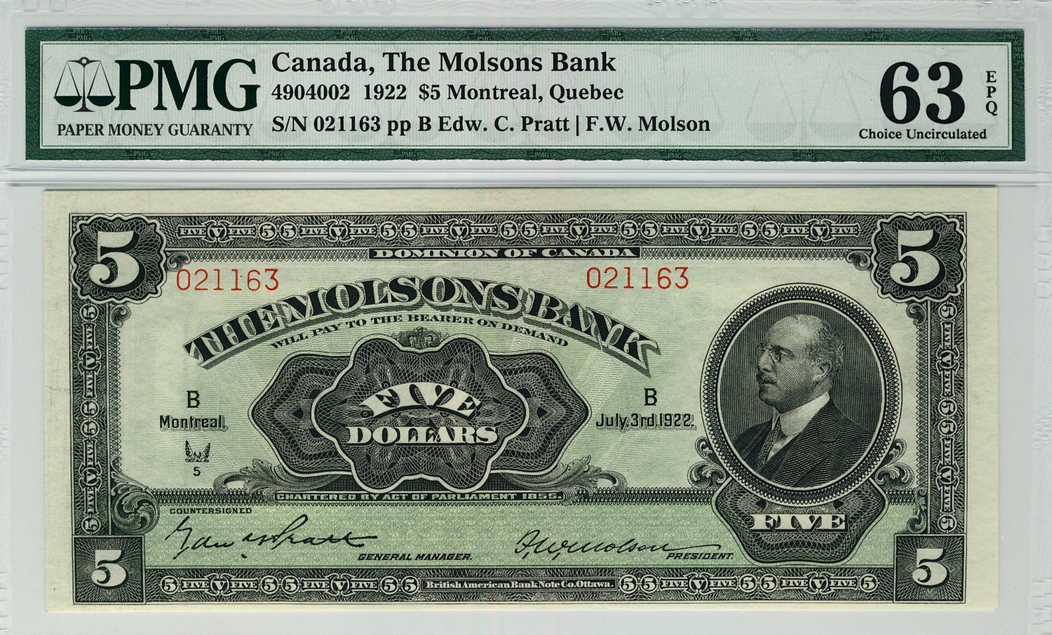 The Molsons Bank 1922 $5 021163 CH-490-40-02 PMG UNC63 EPQ