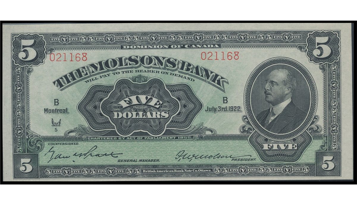 The Molsons Bank; 1922 $5 #021168 CH-490-40-02, PMG CH UNC64. Thomas Flynn Collection.