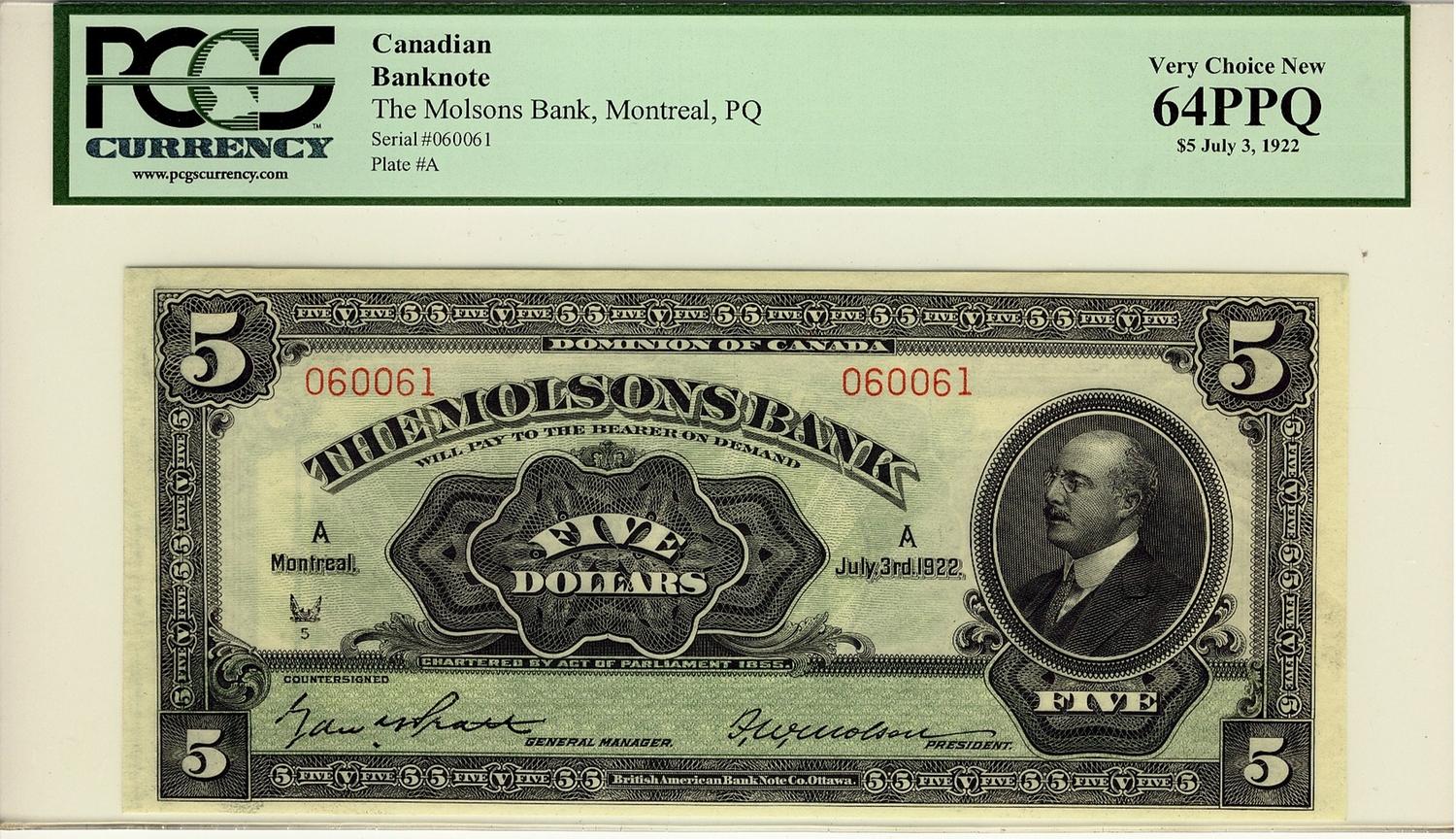 The Molsons Bank, 1922 $5 #060061, CH-490-40-02, PCGS UNC64PPQ. A very nice and attractive example.