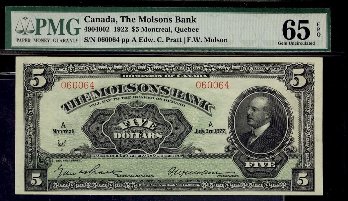 The Molsons Bank 1922 $5 #060064 CH-490-40-02 PMG Gem UNC65. So nice and popular!