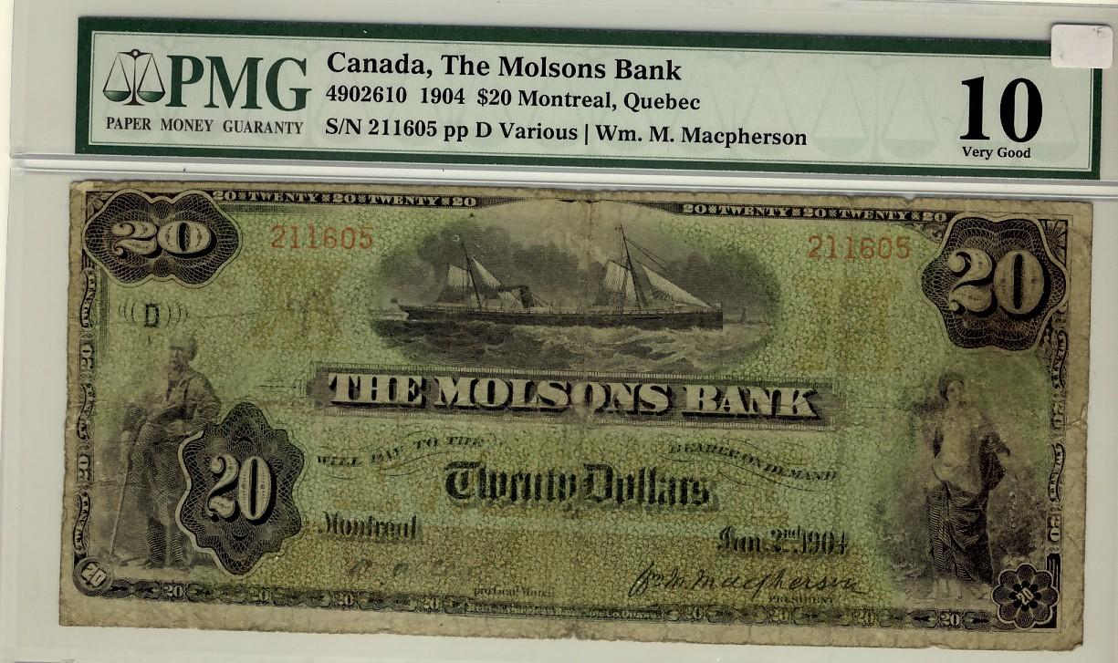 The Molsons Bank of Canada, 1904 $20 #211605, CH-490-26-10, PMG VG10.