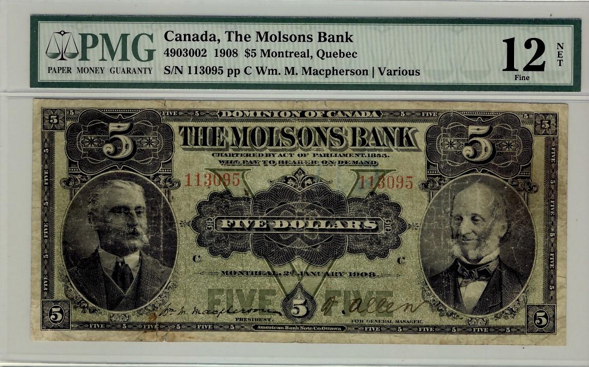 The Molsons Bank of Canada, 1908 $5 #113095, CH-490-30-02, PMG F12 Net. An affordable example.