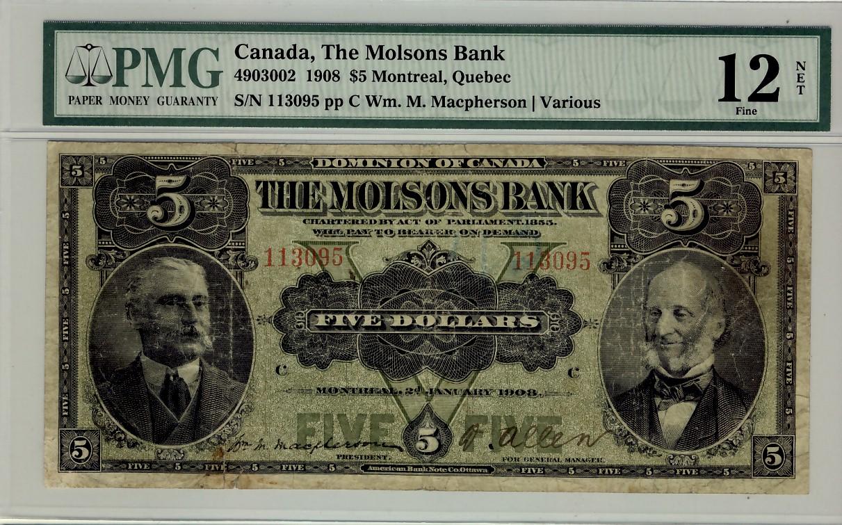 The Molsons Bank of Canada, 1908 $5 #113095, CH-490-30-02, PMG F12 Net. Designated Splits.