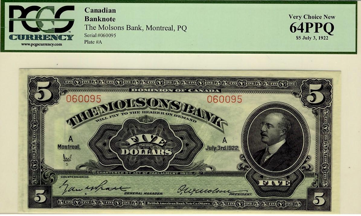 The Molsons Bank of Canada, 1922 $5 #060095, CH-490-40-02, PCGS CH UNC64PPQ.