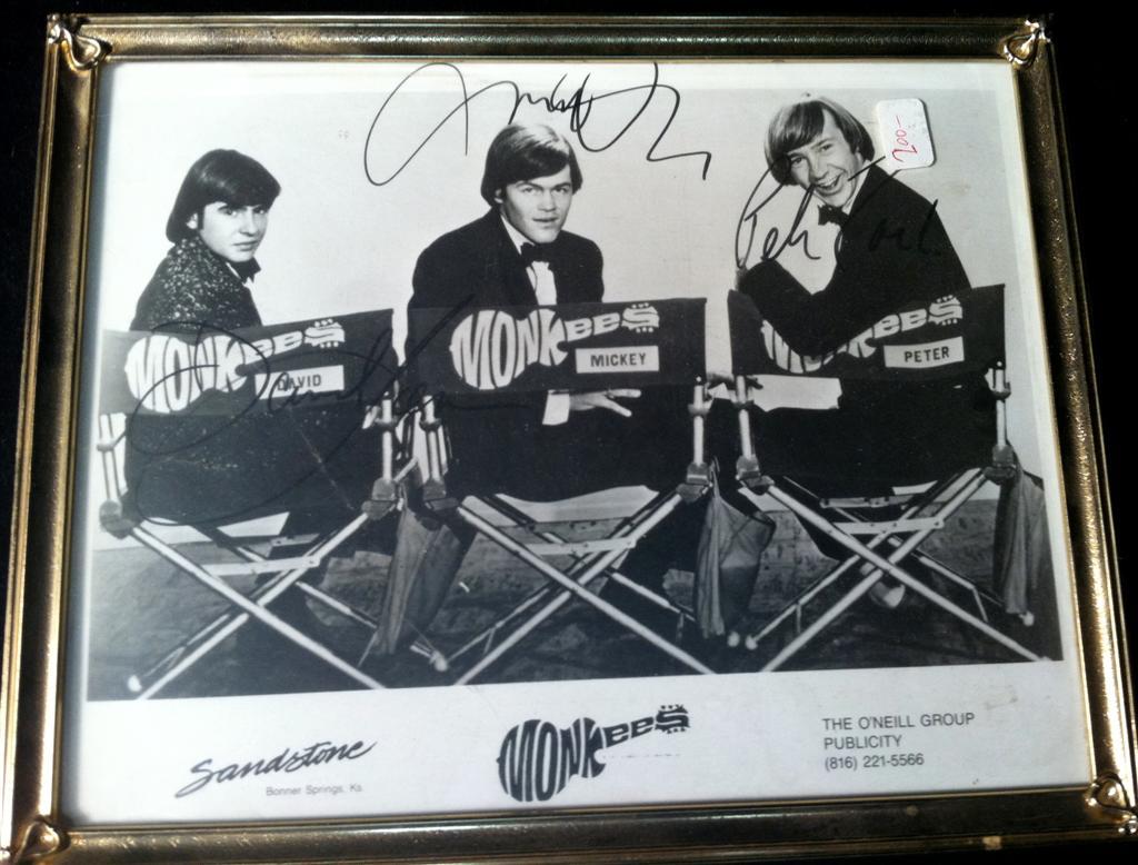 The Monkees Autographed Photo - A framed 8" x 10" publicity still of The Monkees signed by Davy Jones, Micky Dolenz and Peter Tork.