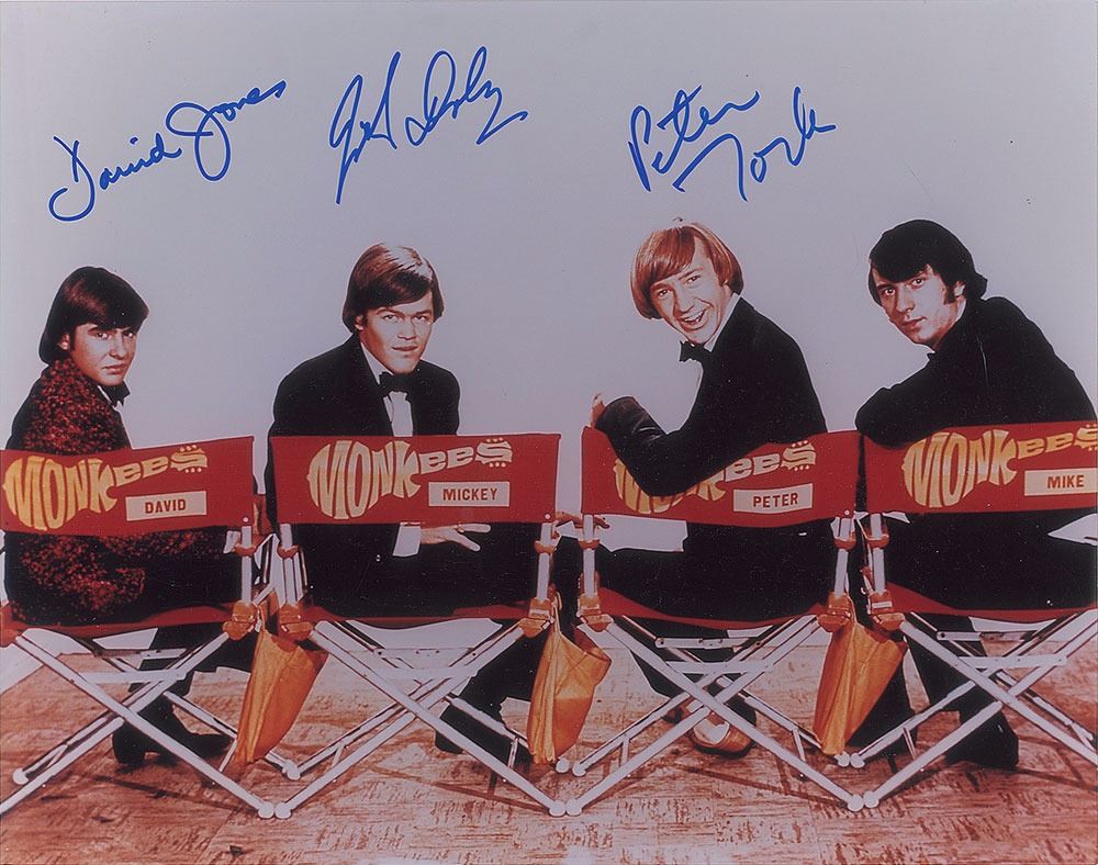 Color glossy 14 x 11 photo of the band sitting in director’s chairs, signed in blue felt tip by David Jones, Mickey Dolenz, and Peter Tork. In fine condition.
