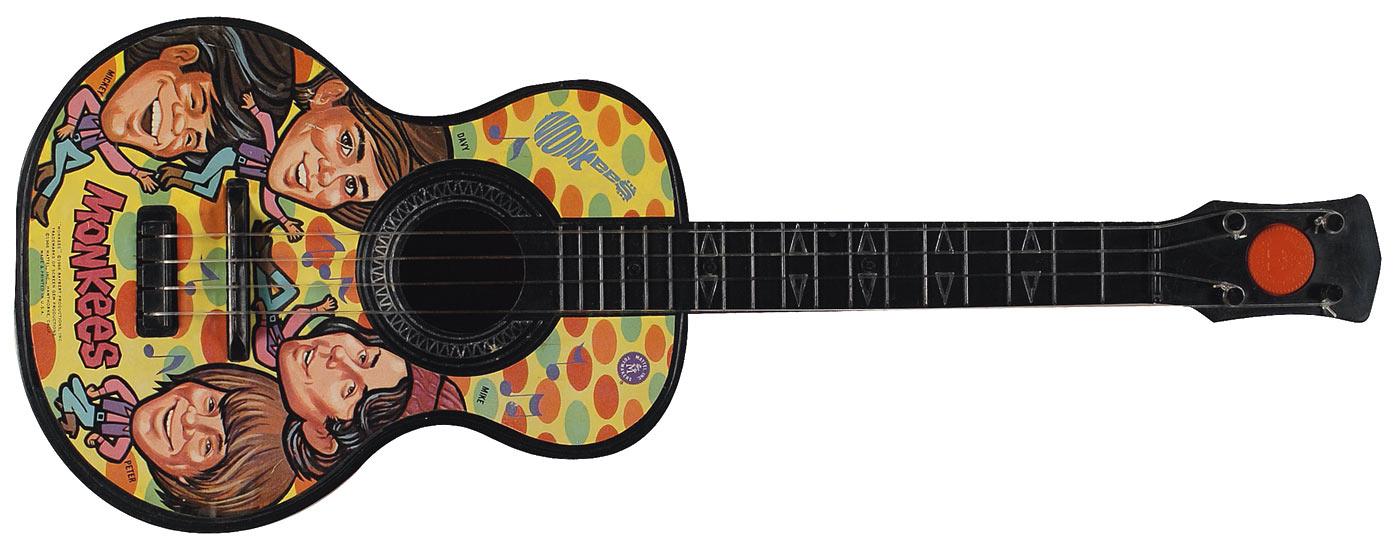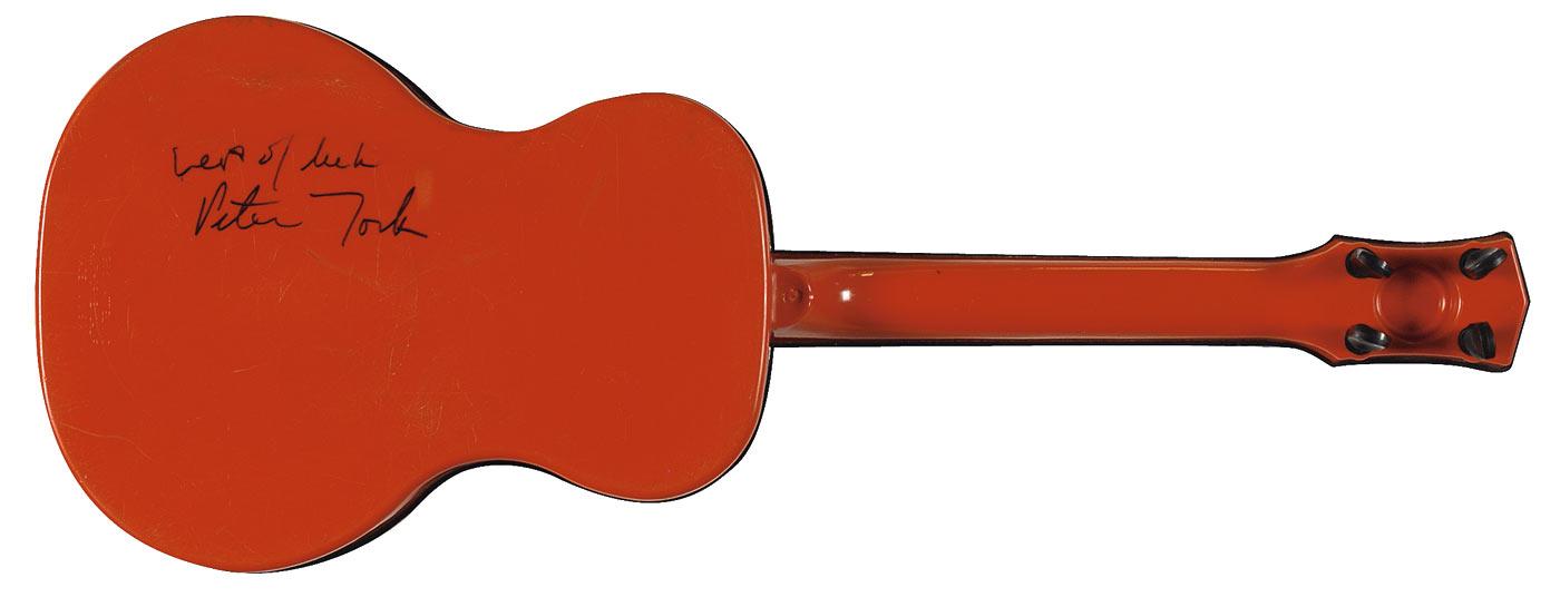 Original Monkees toy guitar, measuring 20 inches long, signed on the back in black felt tip, “Lots of luck, Peter Tork.” In fine condition, with scattered surface marks and dings to back, and some light expected age wear.