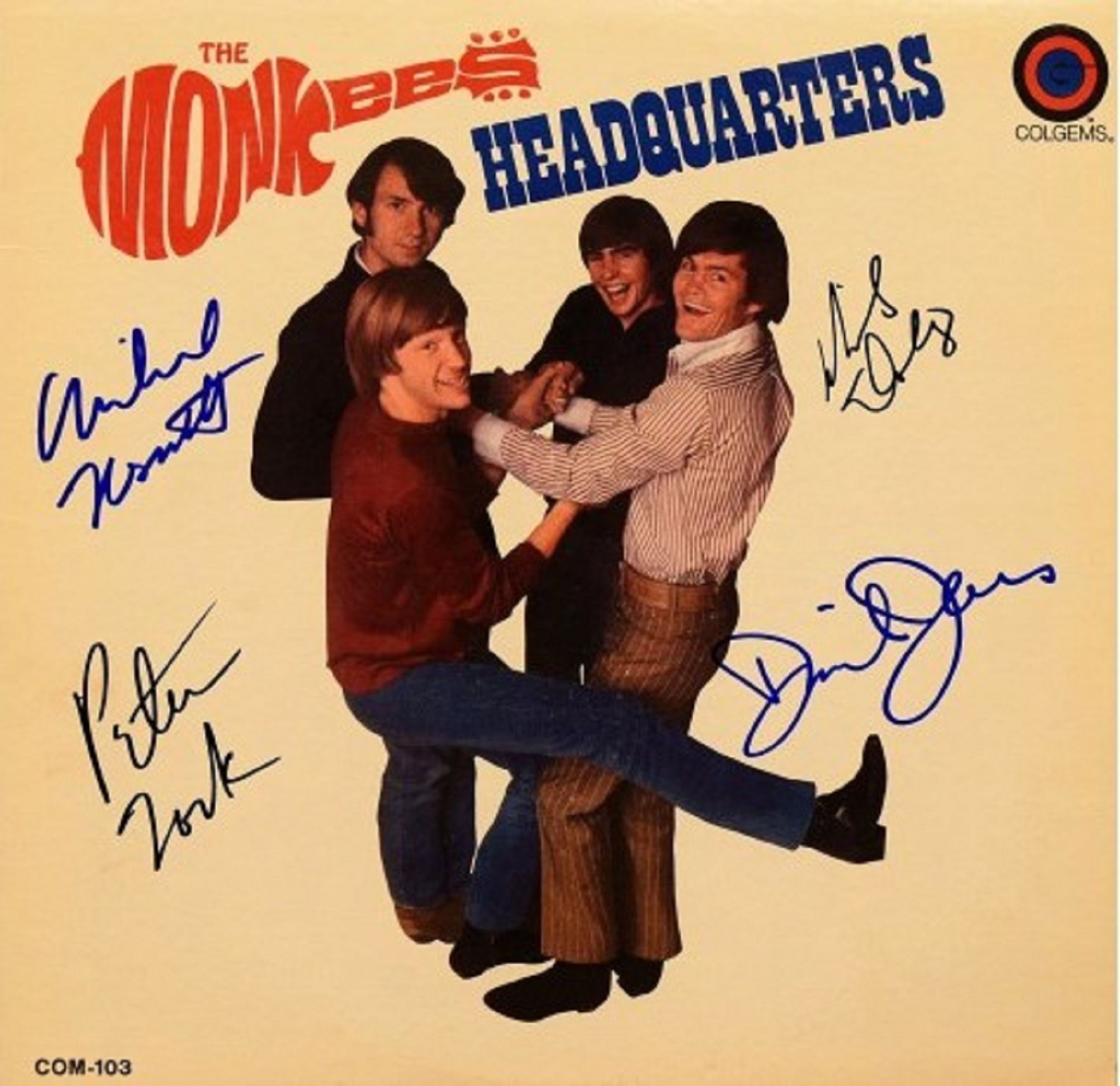 The Monkees 1967 hit Headquarters album autographed by Davy Jones, Mike Nesmith, Peter Tork and Micky Dolenz.
