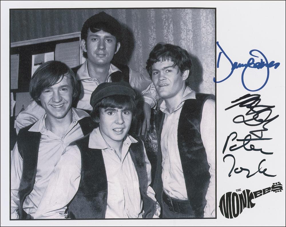Glossy 10 x 8 group photo, signed in black felt tip by Mickey Dolenz and Peter Tork, and in blue felt tip by Davy Jones. In very fine condition.