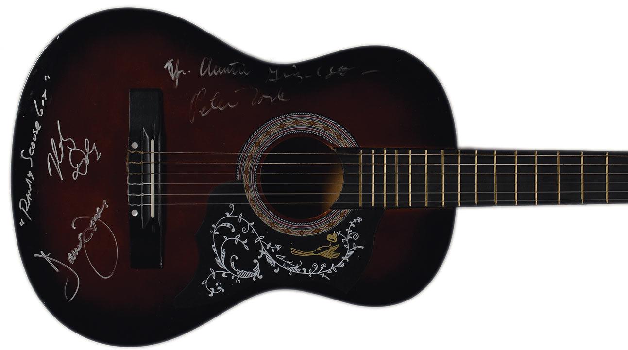 Natural wood-finish six-string acoustic guitar, signed on the body in silver ink by David Jones, Micky Dolenz (adding “Randy Scouse Git”), and Peter Tork (adding “Yr. Auntie Grizelda”). In fine condition. Oversized.