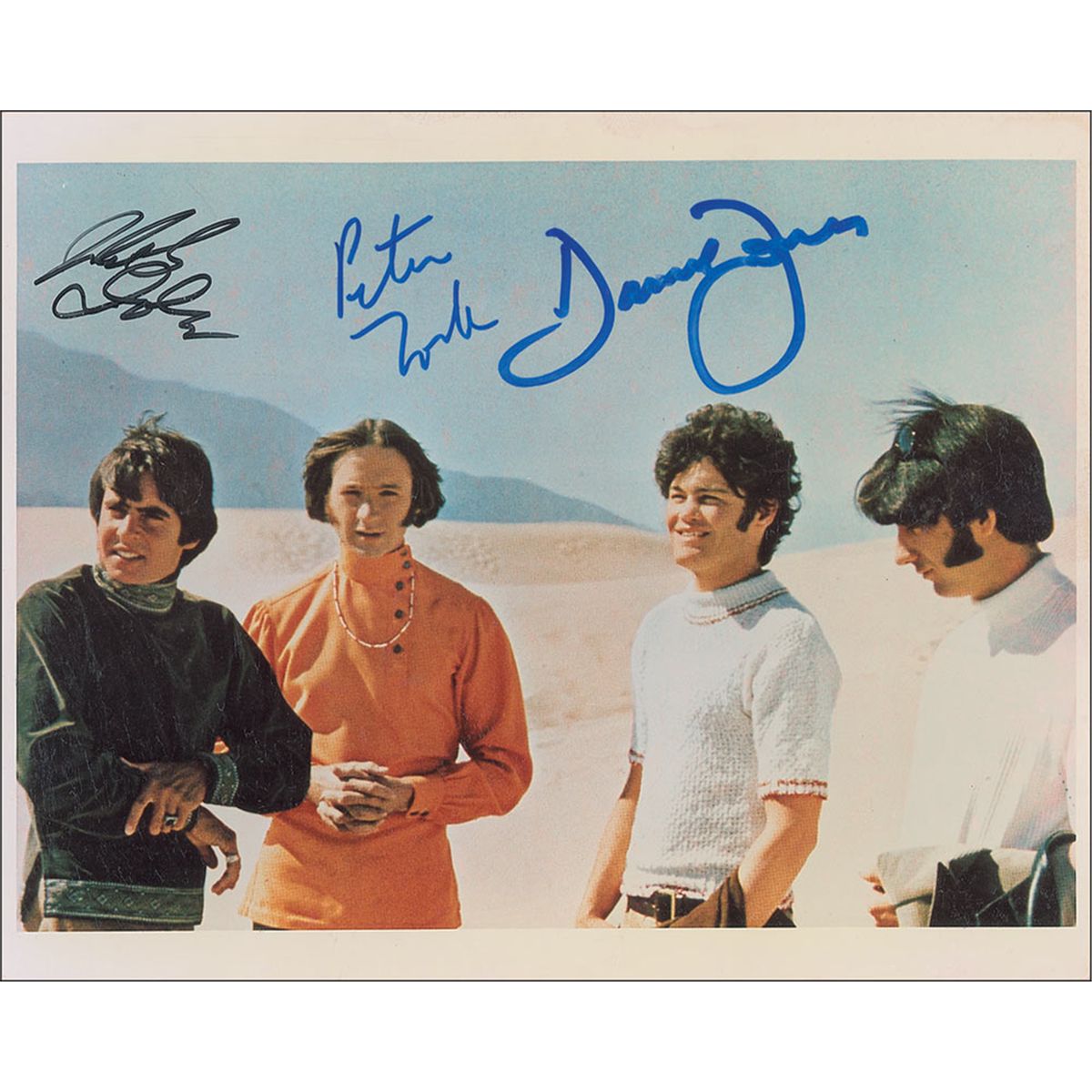 Color glossy 10 x 8 photo of the Monkees in the desert in Head, signed in blue felt tip by Peter Tork and David Jones and in black felt tip by Mickey Dolenz. Scattered light wear and rubbing to finish, otherwise fine condition.