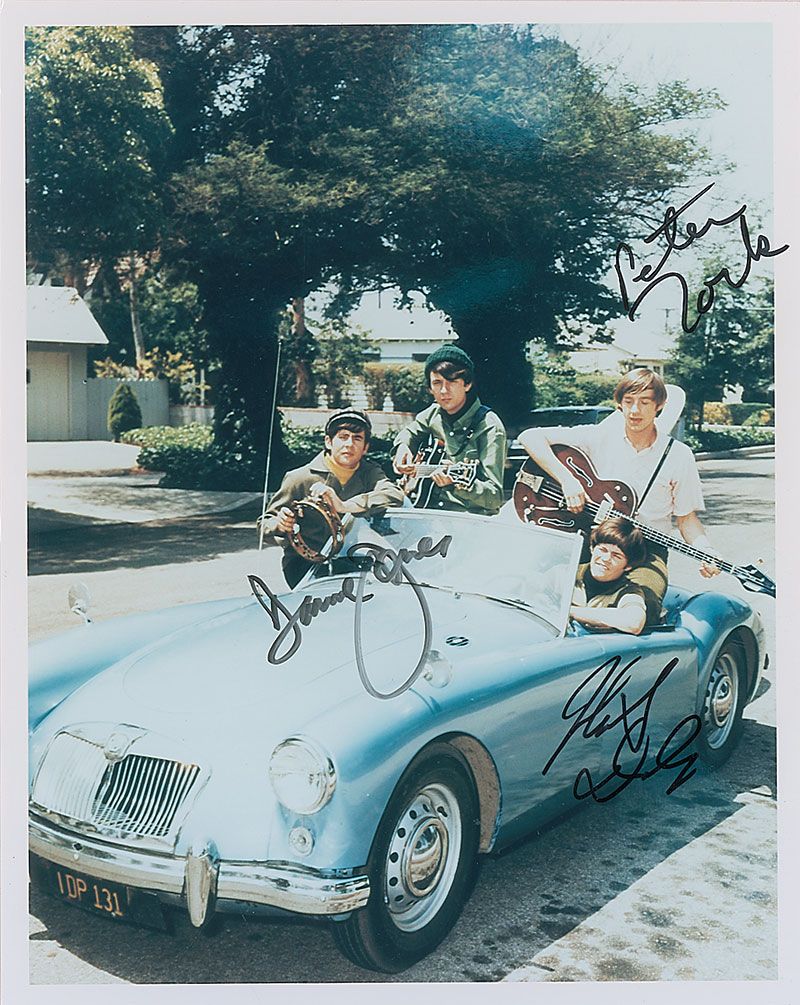 Two color glossy photos of the band, one 8 x 10 and one 10 x 8, each signed in black felt tip by David Jones, Peter Tork, and Mickey Dolenz. In fine condition.