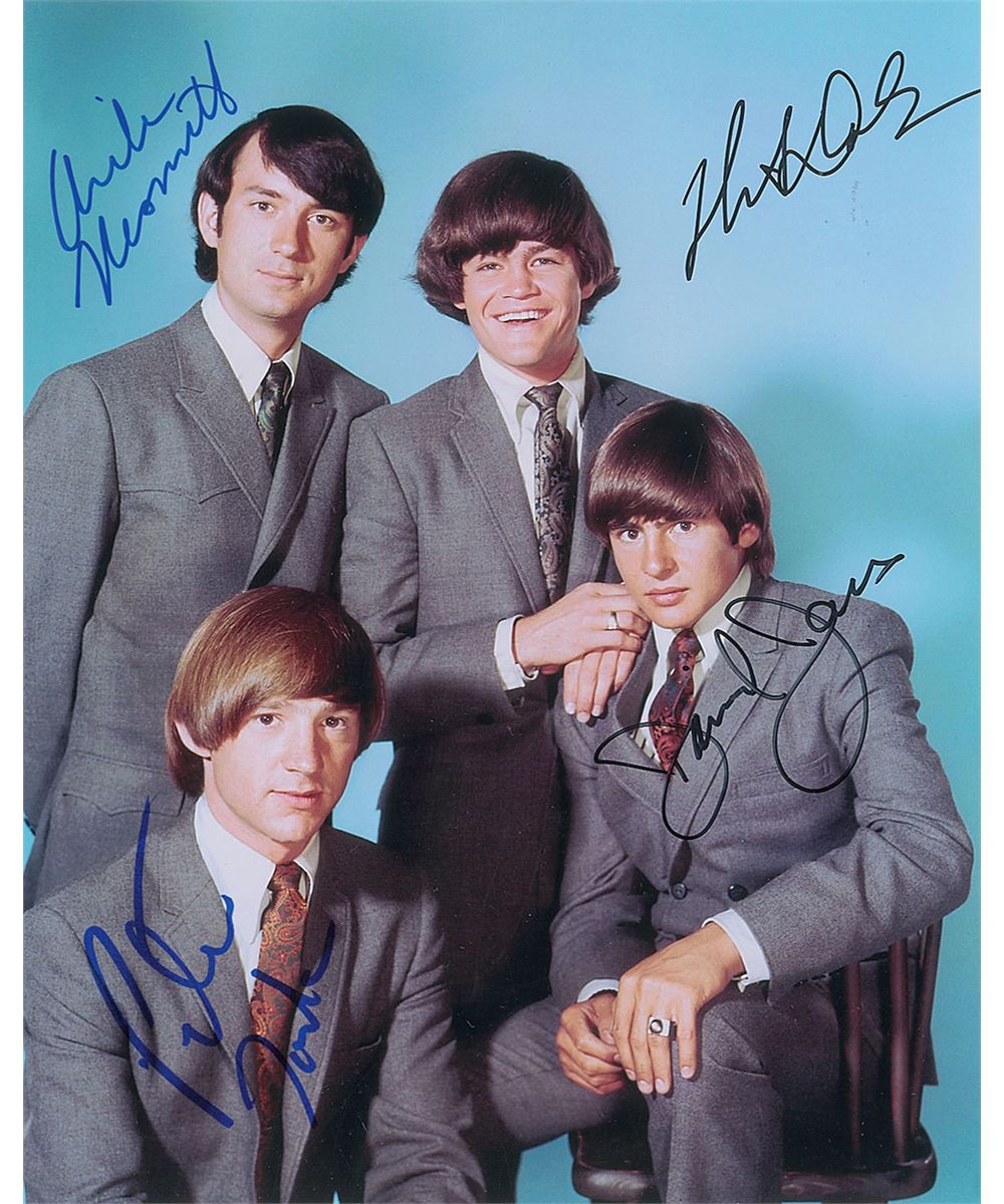 Color glossy 8 x 10 group photo of the Monkees in gray suits, signed in blue and black felt tip by Michael Nesmith, David Jones, Peter Tork, and Mickey Dolenz. In very fine condition. Accompanied by a full letter of authenticity from Roger Epperson/REAL.