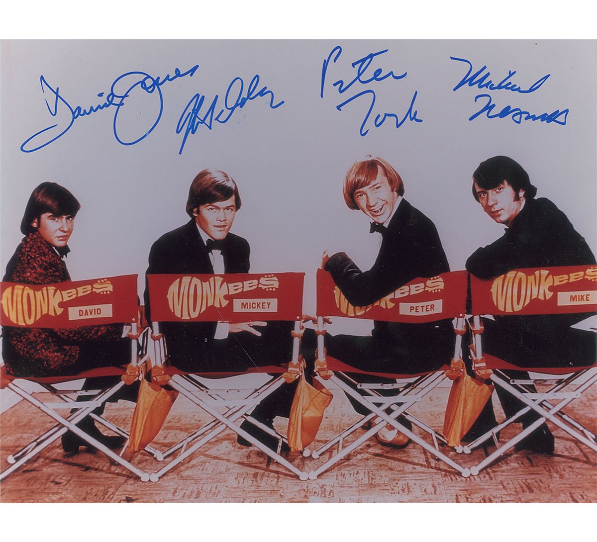 Classic color glossy 14 x 11 photo of the band sitting in director’s chairs, signed in blue felt tip by David Jones, Mickey Dolenz, Peter Tork, and Michael Nesmith. In fine condition, with a few minor brushes to the Jones and Dolenz signatures.