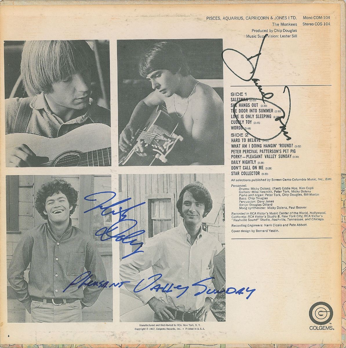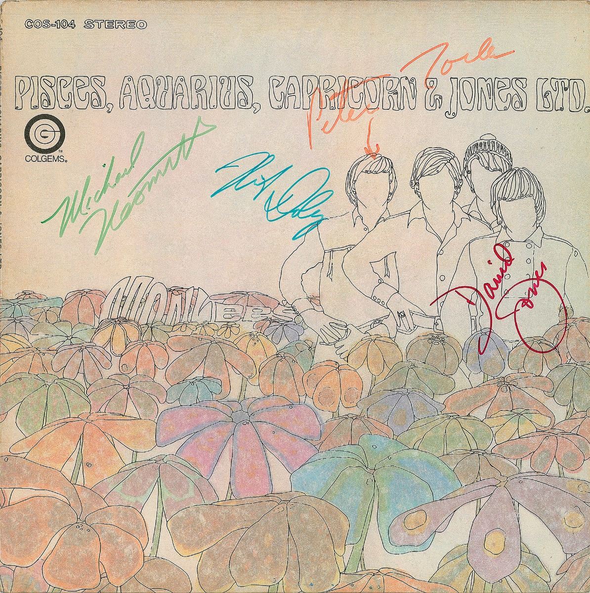 Pisces, Aquarius, Capricorn & Jones Ltd. album signed on the front cover in various colored felt tip by David Jones, Micky Dolenz, Michael Nesmith, and Peter Tork, who draws an arrow to his silhouette. Also signed on the back cover by Jones and Dolenz, who adds “Pleasant Valley Sunday.” In fine condition. The record is included.