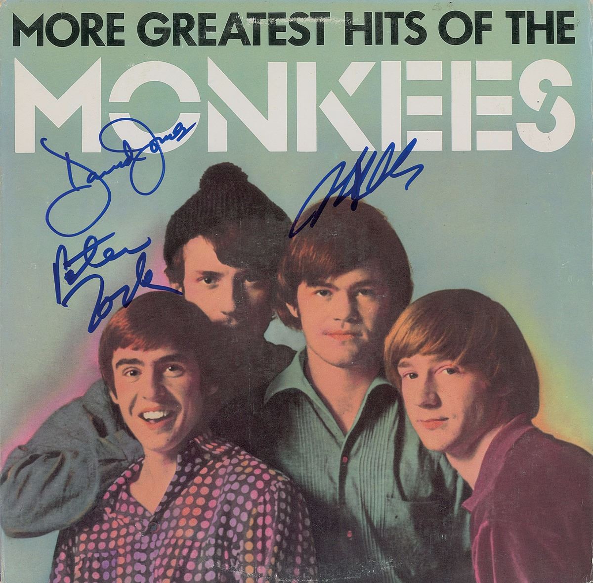 More Greatest Hits album signed on the front cover in blue felt tip by Davy Jones, Mickey Dolenz, and Peter Tork. In fine condition. The record is included. Pre-certified REAL.