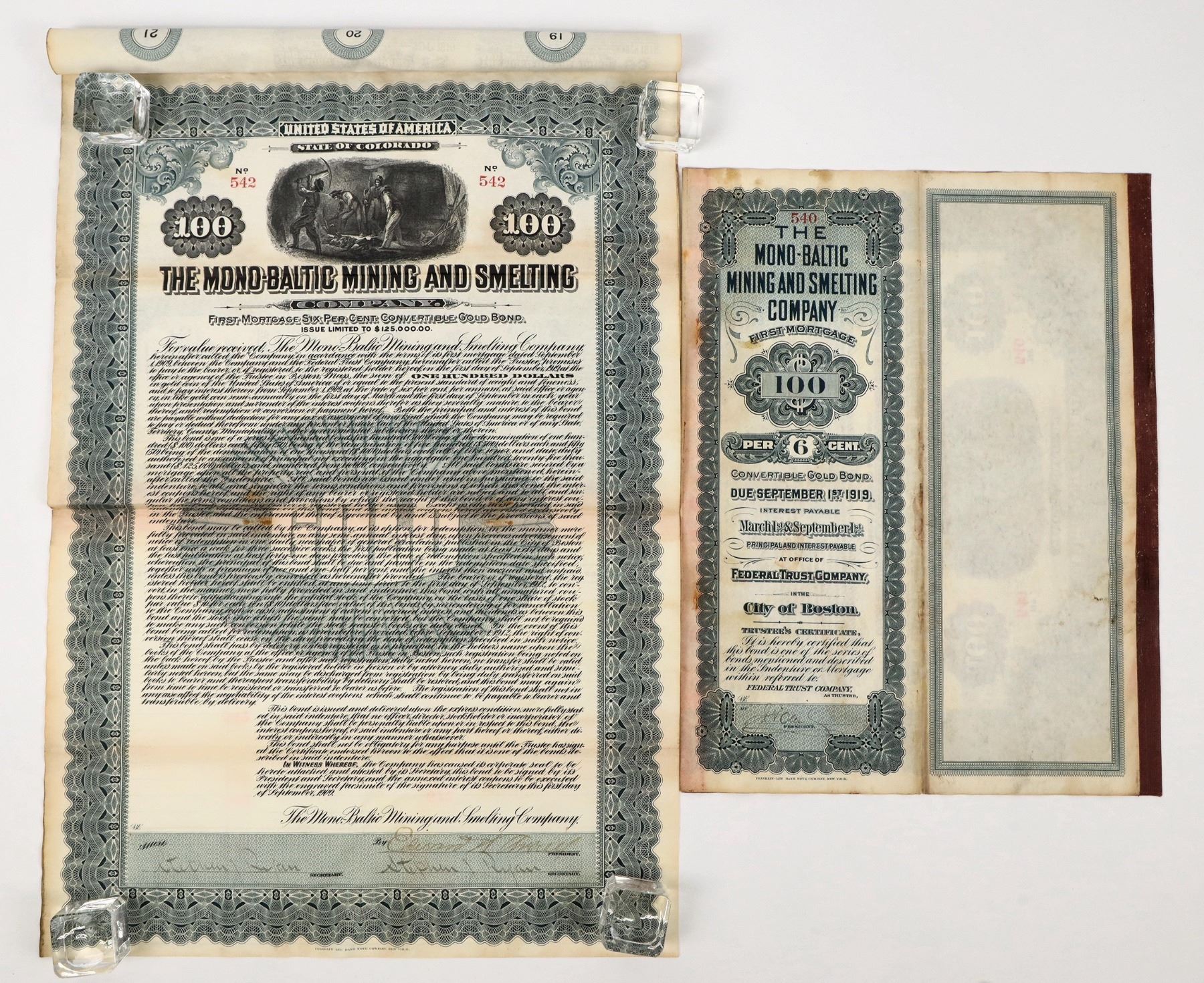 Lot of 2. I/U. Issued 1909. VG cond. The Mono-Baltic Mining and Smelting Co., 100, 6% gold bearer bond, coupons attached. Franklin-Lee BNC printer. The Mining Science Journal of 1910 reports "The property of the Mono-Baltic Mining and Smelting Co. in the Ironton district has received another large portion of the 50 tons of furnace parts and fixtures, wire accessories, stacks, flumes, etc. With all of the huge steel works for the new smelter already at the Mono-Baltic and with this 50 ton shipment delivered the company will have on the ground practically all the necessary equipment for the new smelter. A recent strike of rich ore at the Torpedo mine has caused considerable excitement in local mining circles. The ore encountered assays from $150 to $900 per ton..."