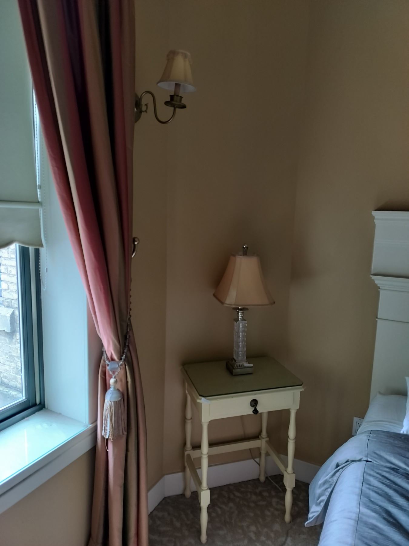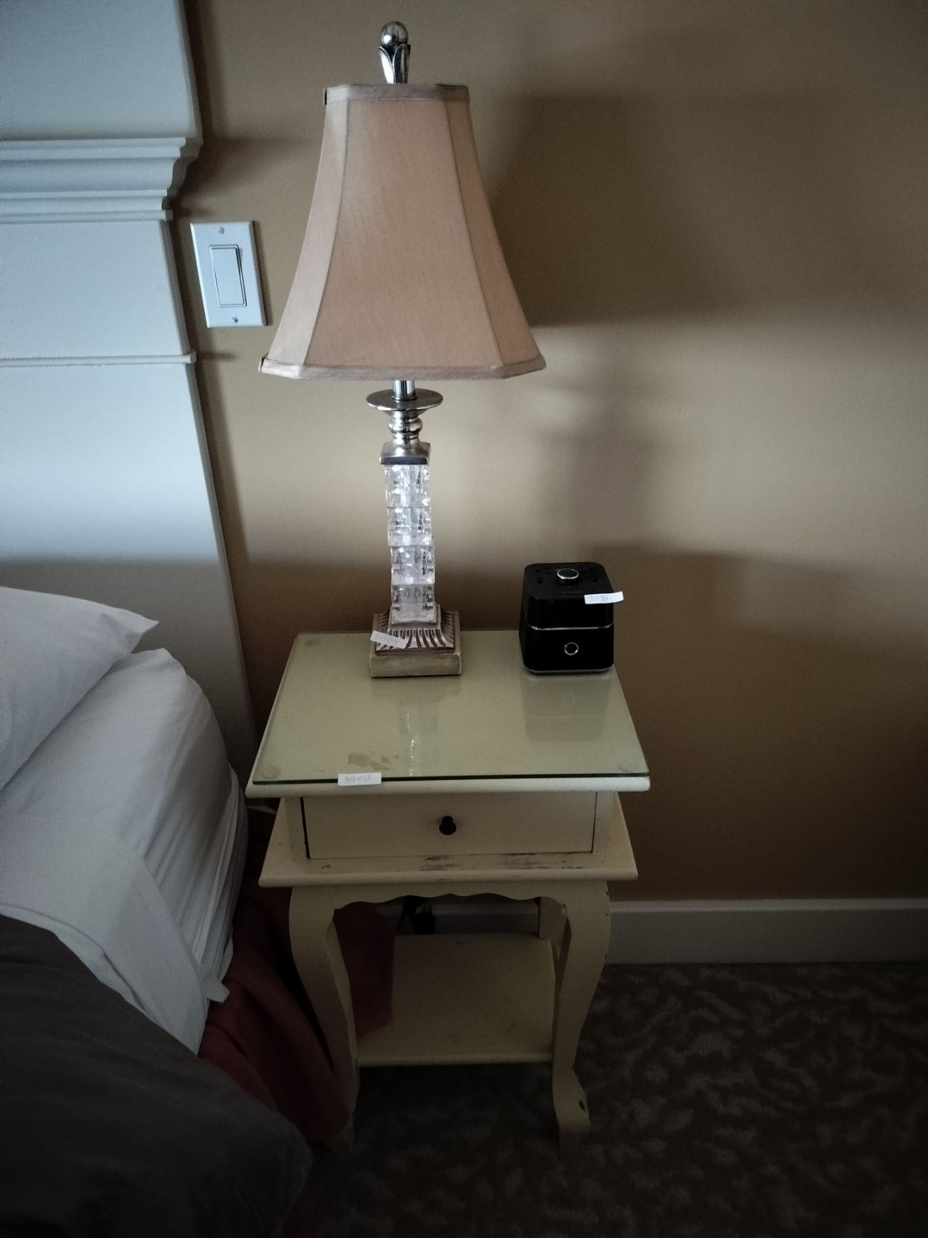 Bedside table (the one with the alarm on it): 27" tall x 16.5" wide x 12.5" deep