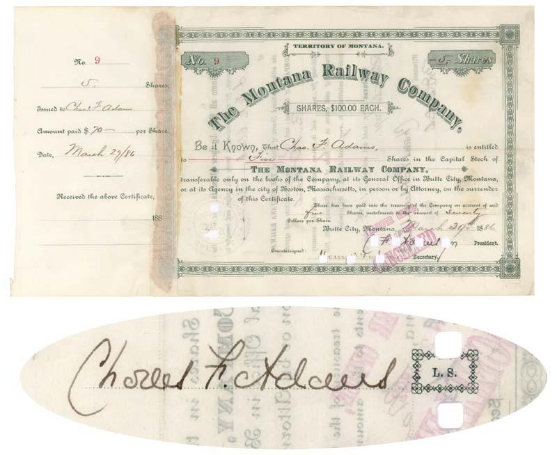 1886, Territory of Montana. Stock certificate for 5 shares. Green. Issued to and signed twice by Charles Francis Adams, Jr. (1835 - 1915) Grandson of Louisa Catherine and John Quincy Adams; served as a colonel in the Union Army during the Civil War; Railroad Executive following the war. Some light glue residue at stub. Fine. Stamp and hole punch cancelled with the later affecting Adams' signature as President, his signature on verso is unaffected.