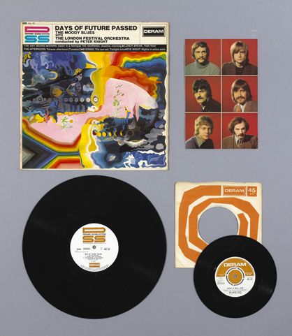 'Days of Future Passed' Deram (DML 707) framed with the album sleeve band portraits and Deram 45 'Nights In White Satin' (DM 161). Also with The Moody Blues 45 'Go Now!' Decca (DFE 8622) also framed with sleeve and Procol Harum 'A Whiter Shade of Pale' album sleeve and sheet music framed display. (3 items)