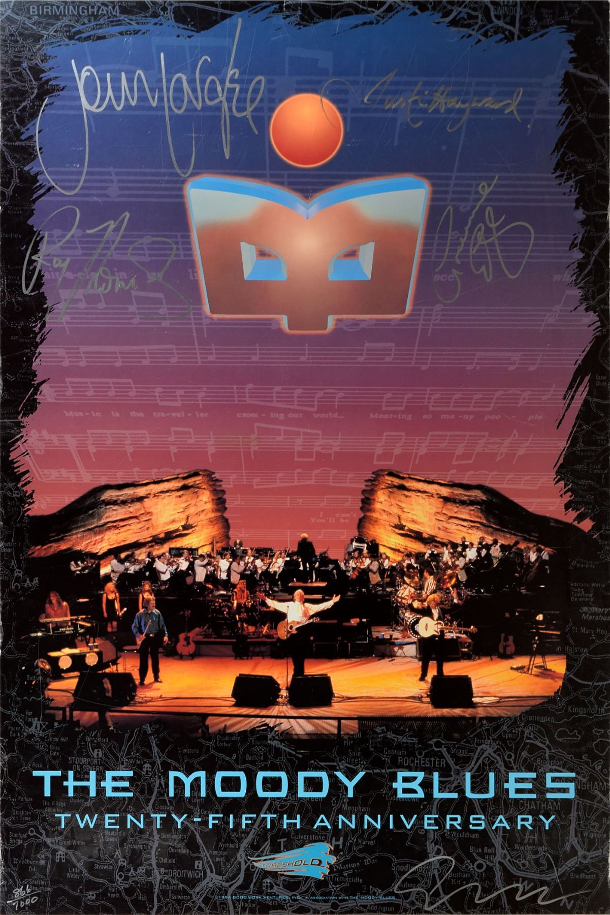Limited edition color 24 x 36 poster commemorating the 25th anniversary of the Moody Blues, numbered 866/7000, signed in silver ink by John Lodge, Graeme Edge, Ray Thomas, and Justin Hayward. Rolled and in fine condition, with scattered light creasing.