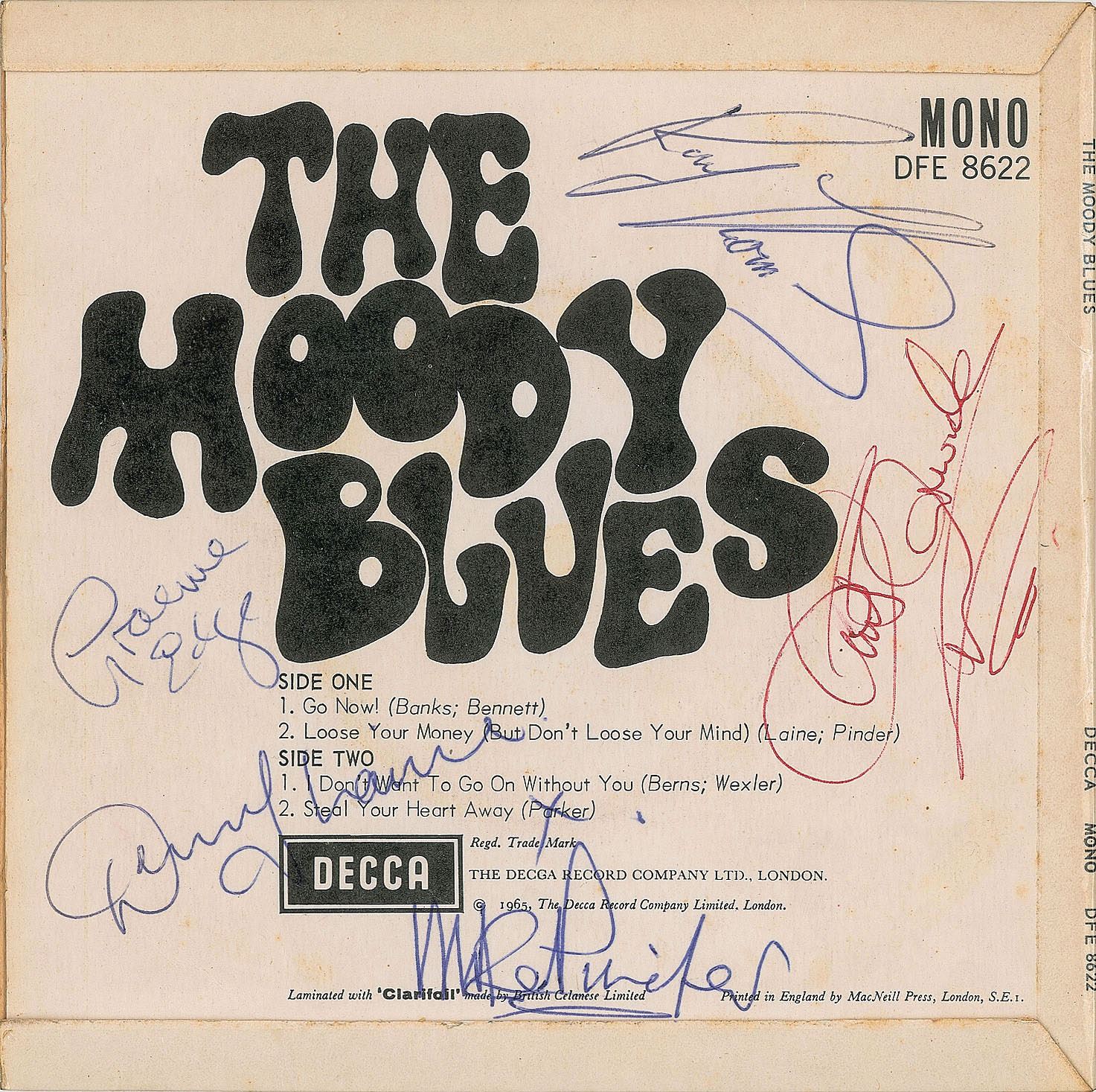 Decca Records 45 RPM record for the Moody Blues' self-titled EP, signed on the back cover in blue ballpoint by Denny Laine, Mike Pinder, Ray Thomas, and Graeme Edge, and in red ballpoint by Clint Warwick. In fine condition, with some corner creasing to the front. The record is included.