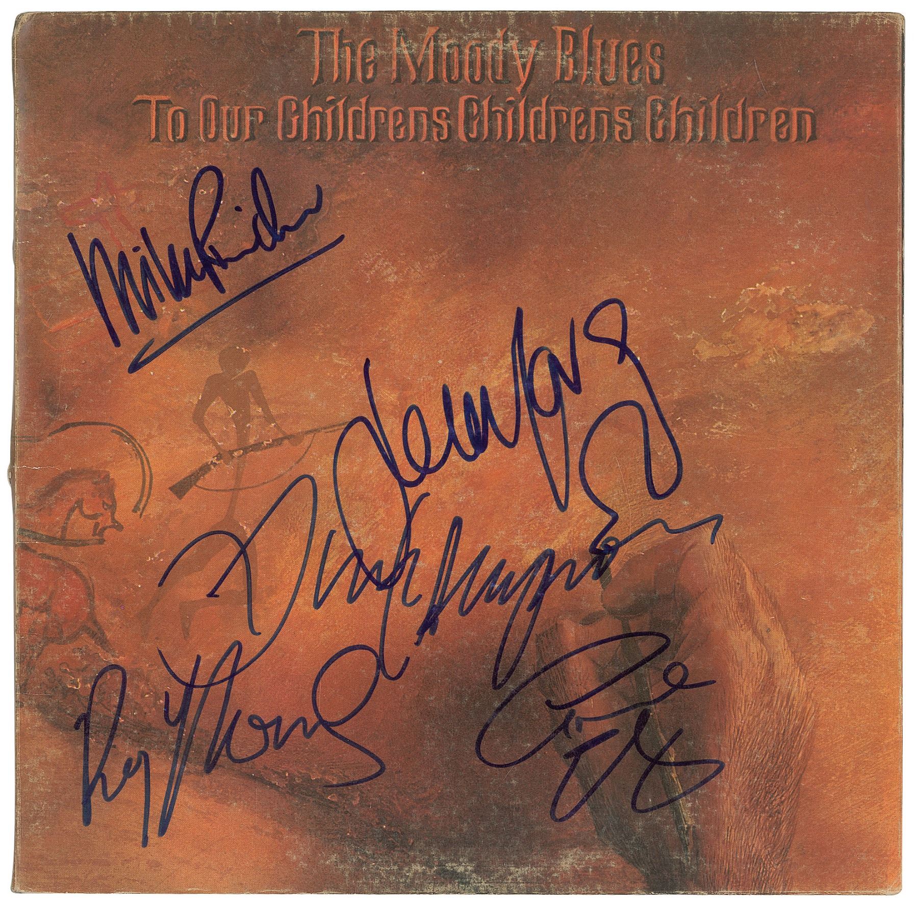 To Our Children's Children's Children album by The Moody Blues, signed on the front cover in blue felt tip by Justin Hayward, John Lodge, Ray Thomas, Graeme Edge, and Mike Pinder. In fine condition, with light scuffing and edge wear. The record is not included.