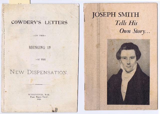 Two Mormon pamphlets: Cowdery's Letters on the Bringing in of the New Dispensation," Free Press Print, Burlington, Wis., 1899. 5 1/4 x 7 3/4, 31 pp., side-sewn. Text of letters written by Mormon pioneer Oliver Cowdery during his travels with Joseph Smith in 1834-35. "Joseph Smith and Oliver Cowdery taught only in the schoolhouse of the Almighty...Mormonism is now a moral, a philosophical and a national element which imprints itself on the face of society everywhere... It is despised only by men who know next to nothing about it, or men of a past age. The generations coming have to look it in the face...Who shall stop its progress?...The Jews, who were possessed of the oracles of God, had divided into a great variety of sects and parties, each having its own particular faith...and they were unable to come together in the unity of the faith...tossed about by every wind of doctrine, carried away by novel and strange interpretations and unfounded theories...substituting the wildest opinions for the truth faith...So in the present age previous to the institution of Mormonism, the Christian nations were divided into more than 600 different sects, each having its own faith...." Some wear at upper right tip, cover soiling, fragment of rubber band(?) at bottom of cover leaf, else good plus. Rare. * "Joseph Smith Tells His Own Story," n.d. but judged c. 1940, published in Salt Lake City. 5 x 7 1/2, 24 pp. + list of Mission addresses around the world, from Argentina to "West Spanish-America" (Los Angeles!). Cover portrait, frontispiece photo of Smith's birthplace in Sharon, Vt., The Hill Cumorah, Palmyra, N.Y., and other photos. Lower right corner of cover folded over, neat underlining on p. 3, addresses and times of local church services in ink on outside back, cover foxed and toned, some uniform toning of rose coated text, else good. (2 pcs.)