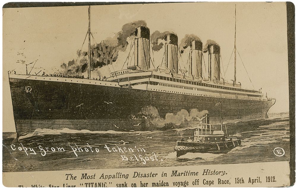 Unused postcard featuring an illustration of the Titanic alongside a much smaller ship, captioned at the bottom: ”Copy from photo taken in Belfast. The Most Appalling Disaster in Maritime History. The White Star Liner ‘Titanic,’ sunk on her maiden voyage, off Cape Race, 15th April, 1912.” In very good condition, with a crease to the lower left corner, silvering to dark areas of the image, and slightly miscut.