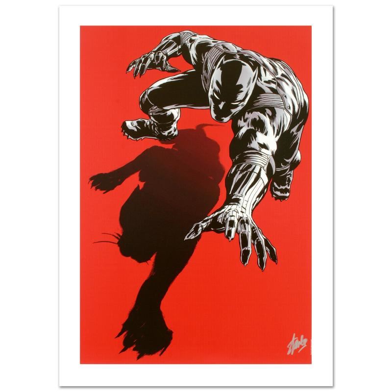 A piece of comic book history, this limited edition, from original art by Patrick Zircher, depicts BLack Panther. Zircher's early career as an illustrator in the genre began with production of several completed works for Villains and Vigilantes, Champions and other pen and paper role-playing games as well as early stints with independent comic book publishers. Following this he went on to work largely for Marvel Comics on leading titles like Iron Man, Thunderbolts and New Warriors but also did a considerable amount of work for DC. He is currently exclusive with Marvel Comics. "The Most Dangerous Man Alive #523.1" is a limited edition giclee on canvas by Patrick Zircher presented by Marvel Comics, numbered and hand signed by the great Stan Lee! Includes Certificate of Authenticity! Measures approx. 18" x 27" (image).