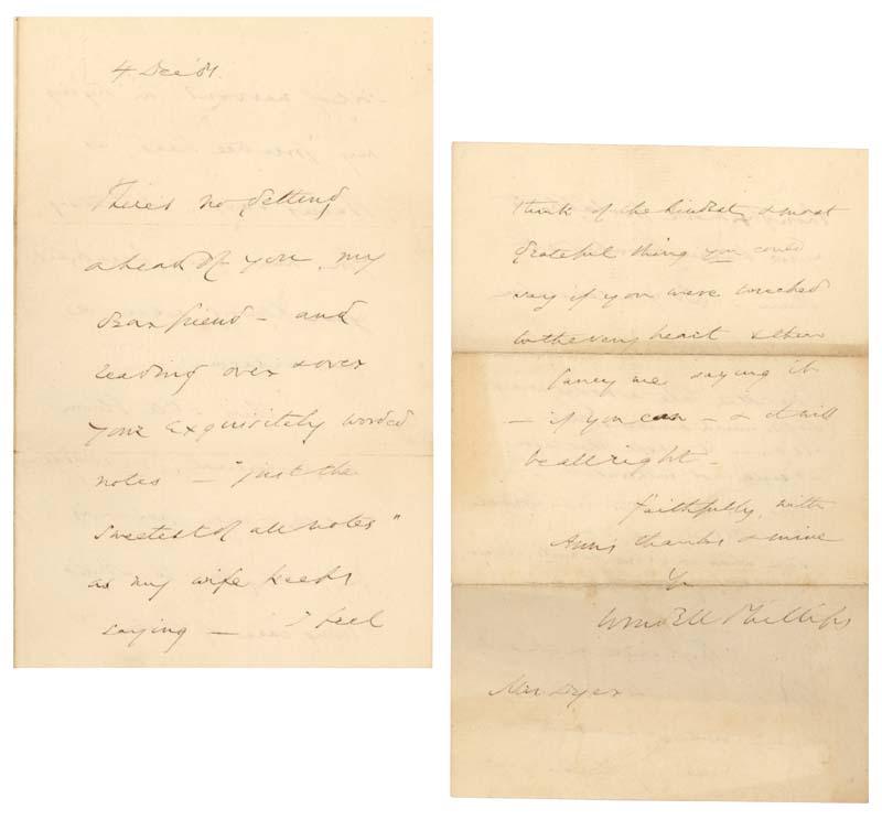WENDELL PHILLIPS (1811-1884) a Prominent abolitionist from 1837, President of the Anti-Slavery Society from 1865-1870. So highly regarded were his oratorical abilities that he was known as "abolition's Golden Trumpet". Like many of his fellow abolitionists, Phillips took pains to eat no cane sugar and wear no clothing made of cotton, since both were produced by the labor of Southern slaves. It was Phillips's contention that racial injustice was the source of all of society's ills. Like William Lloyd Garrison, Phillips denounced the Constitution for tolerating slavery. Autograph Letter Signed. 4pp. 5" x 8". n.p. 4 Dec '81. Phillips writes to a fellow lawyer and friend, Mr. Dyer: "There is no setting ahead of you my bar friend – and reading over and over you exquisitely words – just the sweetest of all notes” as my wife keeps saying. I feel sort of nervous in trying my ‘rentice hand, as Bacus says, at telling you how very beautiful your flowers were – how welcome….” Phillips goes on to relay a song to his friend, then: “…but even without Ben Johnson in my view, my vote’s nothing to yours – Please just think of the most grateful things you could say if you were touched to the very heart & then fancy me saying it – if you can - & it will be alright…Wendell Phillips.” Light toning to folds on last page, else Fine.