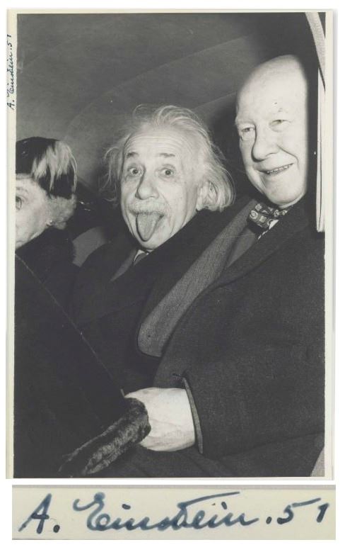 Very rare photo signed by Albert Einstein, on the occasion of the Nobel Prize winner playfully sticking out his tongue to a group of photographers on his 72nd birthday. Photo was snapped on 14 March 1951 by Arthur Sasse, a UPI photographer whose employers were at first hesitant about publishing the iconoclastic image of Einstein; when they did, Einstein was so amused by it that he ordered several prints to give out to close friends. This image is unlike most which crop the photo to show only Einstein. Here, the photo is shown in its full context with Einstein seated between his wife and Dr. Frank Aydelotte, head of the Institute of Advanced Study in Princeton, after celebrating his birthday at the Princeton Club. Photo is signed along the left margin ''A. Einstein .51'', indicating he signed the image shortly after it was taken. Photo measures 7'' x 10''. Very good to near fine condition. Extraordinarily rare photo signed by Einstein, the most famous and beloved image of him.