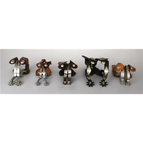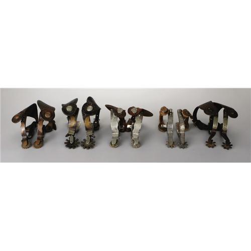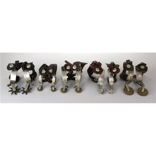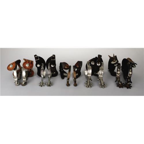 <B>Wally Boone Important Spur Collection.</B></I> Early West Texas master, Wally Boone, forged each of the 25 pairs of spurs in this, the most extensive, highest quality and best-conditioned assemblage of his work known to exist. Wally Boone opened his first spur shop in West Texas in Lubbock in the 1920s and then moved in the 1930s to San Angelo and then finally to Andrews, Texas. Only P. M. Kelly operated a bigger shop in the West Texas area during this time. Wally Boone is widely recognized as being one of a handful of true early pioneers that shaped and defined what would become the Texas spurs. He was one of twelve early Texas style makers featured in Jane Pattie's groundbreaking book, <I>Cowboy Spurs and Their Makers,</B></I> published in 1991. Many of the examples in this collection are the only known pattern of their type in collectors' hands. Some of the collection's highlights include: the only "Texas Centennial", four variations of his most popular design, the "Kent Special", the "Pecos Kidd", the "Eagle, Star Half Moon" and what is widely recognized as the best pair of Wally Boone spurs known, a pair elaborately engraved and mounted with Mexican coins, and photographed in two major books on spurs. Collection Provenance and Publications: Exhibited in <I>Representing the West,</B></I> Sangre De Cristo Arts Center, Pueblo Colorado, September 22 through October 29, 2005. Spurs pictured in <I>Bit and Spur Makers in the Texas Tradition</B></I> by Ned and Jody Martin, pages 94 and 95, and the book jacket. Spurs pictured in <I>The Spur</B></I> by David Stoecklein, pages 6, 7, 73, 79 and 80. <I>Courtesy of Bruce Bartlett, San Antonio.</B></I> Consigned Lot <BR><BR><b>This 2006 March Texas State Historical Association Charity Auction is being held in Austin, TX on February 12 - March 4, 2006. This is a charity auction. All proceeds from donated lots in the auction, commissions from consigned lots, and the buyer's premium go solely to the Texas State Historical Association. The floor auction session is by invitation only. Online bidding ends March 3, 2006 at 10:00PM CT. Your secret maximum bid will compete for you during the floor auction, and it is possible that you may be outbid on the floor after internet bidding closes. The applicable buyer's premium for this auction is an amount equal to 15% (minimum $9 per lot) of the successful bid on ebay. State law requires lots consigned (not donated) to THSA collect full sales tax on items that sell for a total of $5,000 or more. </b>