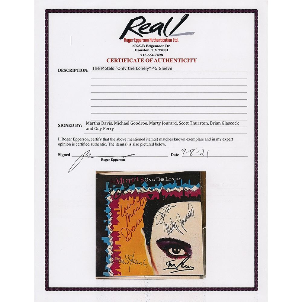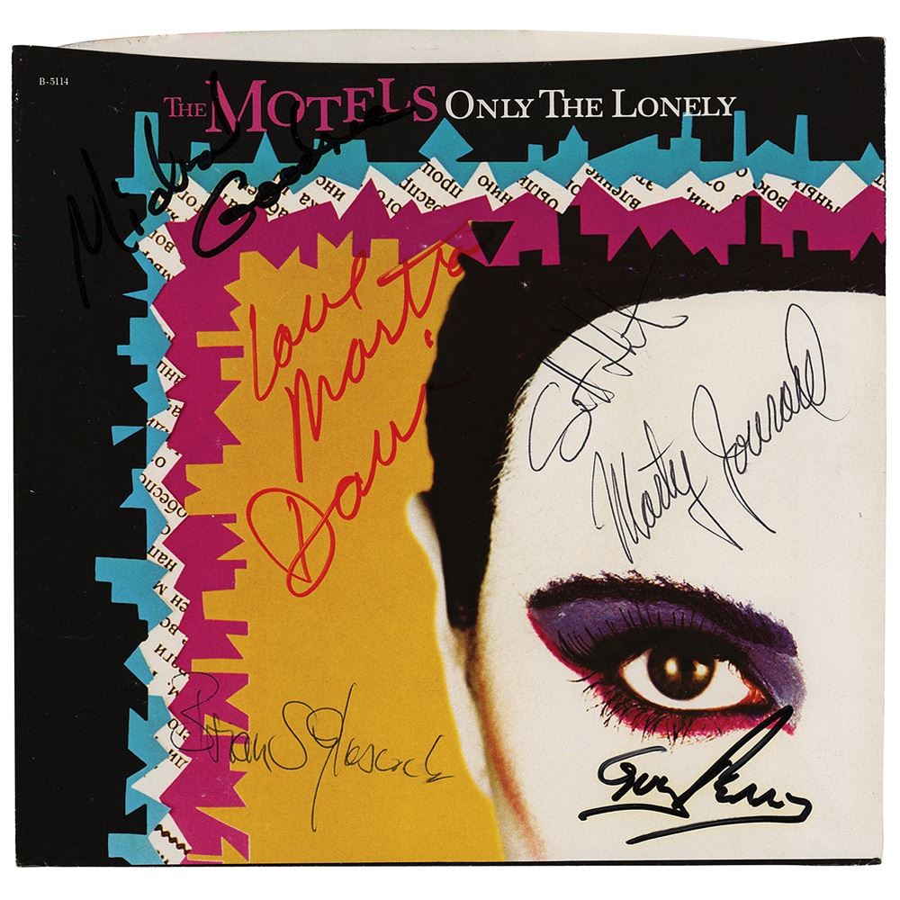 Capitol Records 45 RPM promotional record for The Motels single ‘Only the Lonely,’ signed on the front cover in ink or felt tip by Michael Goodroe, Brian Glascock, Marty Jourard, Guy Perry, Scott Thurston, and Martha Davis, who signs again on the record label. In fine condition. The record is included. Accompanied by a full letter of authenticity from REAL.