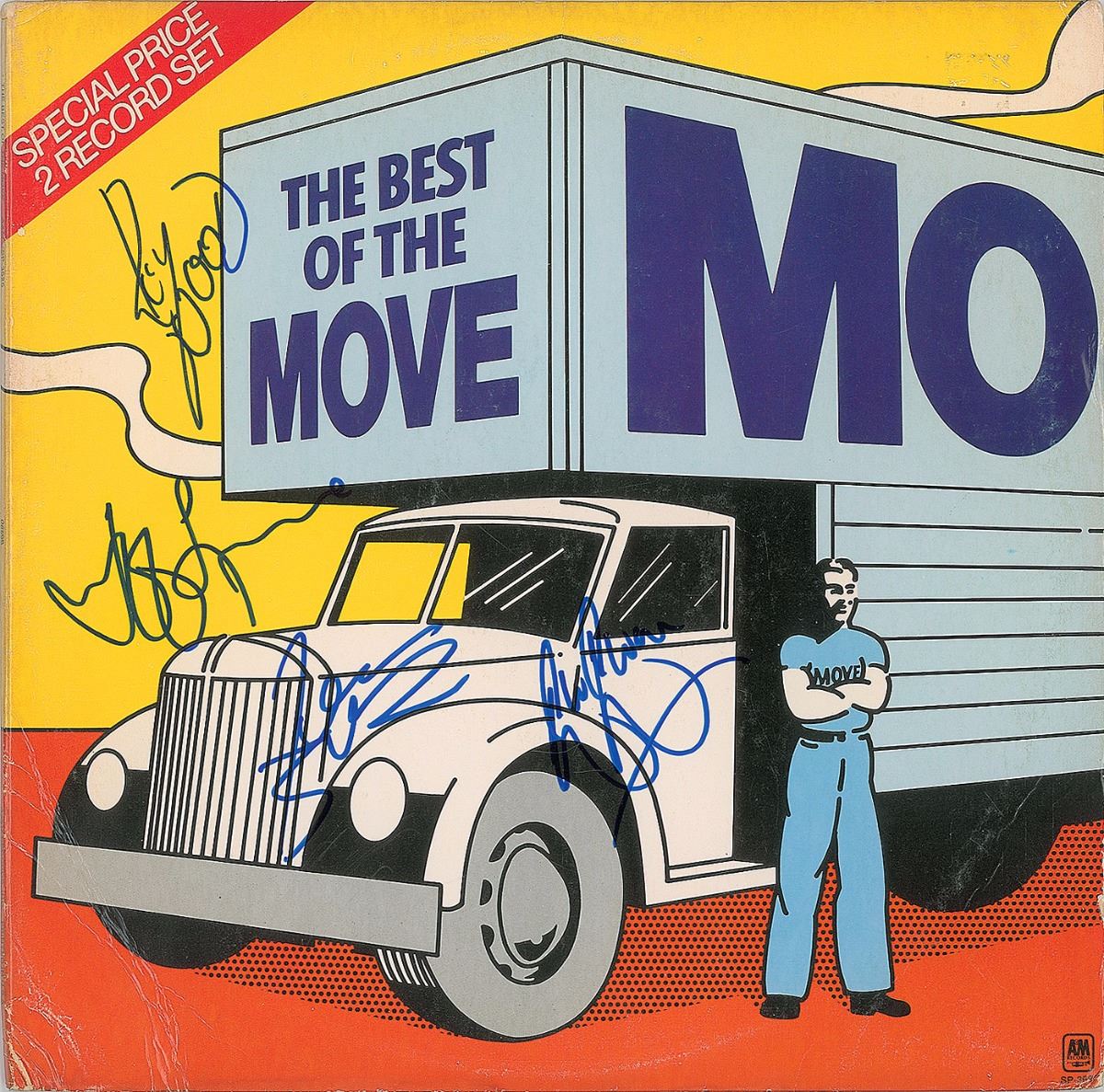The Best of the Move album signed on the front cover in blue felt tip by Jeff Lynne, Bev Bevan, Roy Wood, and Trevor Burton. In fine condition, with creasing to lower left. The record is included.