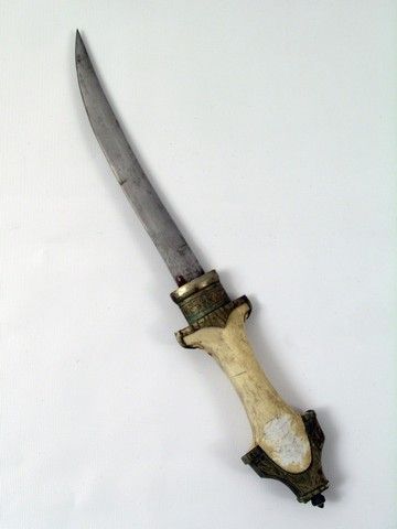 A metal dagger with stylized faux-ivory handle and sheath from the first in the successful remake of the classic "The Mummy" (1999). (Approx. 16 1/2" long).