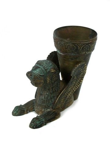 From the hit remake of "The Mummy" (1999) starring Brendon Frasier, this is a screen used brass statue candle holder-chalice. (approx. 5" x 4.25" x 2.5")