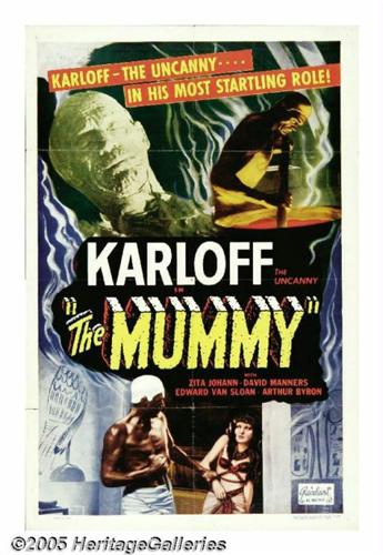 <B>The Mummy (Realart, 1951).</B></I> One Sheet (27" X 41"). Boris Karloff stars as Im-Ho-Tep, a mummy who returns from the dead to locate his lost love, a reincarnated Princess of ancient Egypt. This is another classic from the Universal monster series. There is slight edge wear with a touch more at the crossfolds, multiple corner pinholes, one small border tear and a few light smudge marks. A nice, unrestored poster for this Karloff classic. Very Fine-.