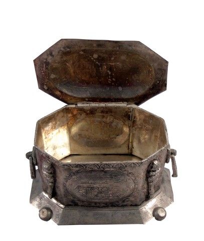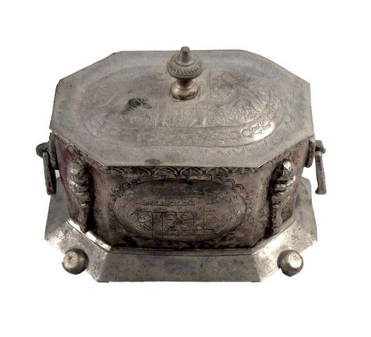 The Munsters Octagon Box Prop - From the beloved 1964 classic goulash TV series "The Munster's" comes this very unusual octagon metal engraved box used as a background set decoration prop. (Approx.7" x 4 1/2").