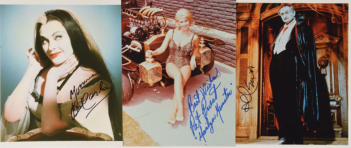 Set of three color glossy 8 x 10 photos, each signed in blue or black felt tip by the actor or actress pictured, including: "Al Lewis," "Best wishes, Pat Priest, 'Marilyn Munster,'" and "Yvonne De Carlo." In overall fine condition.